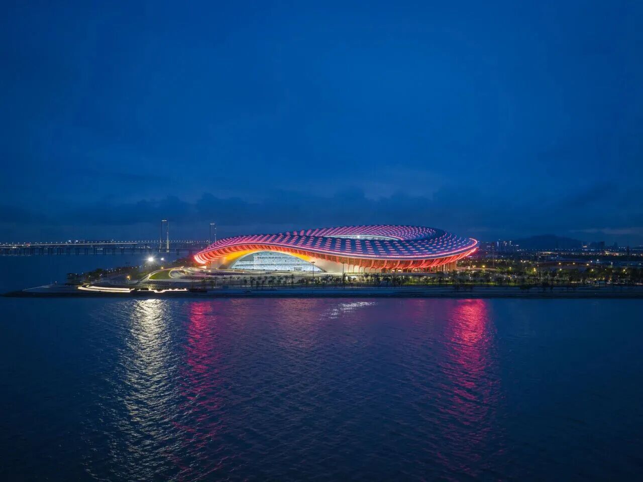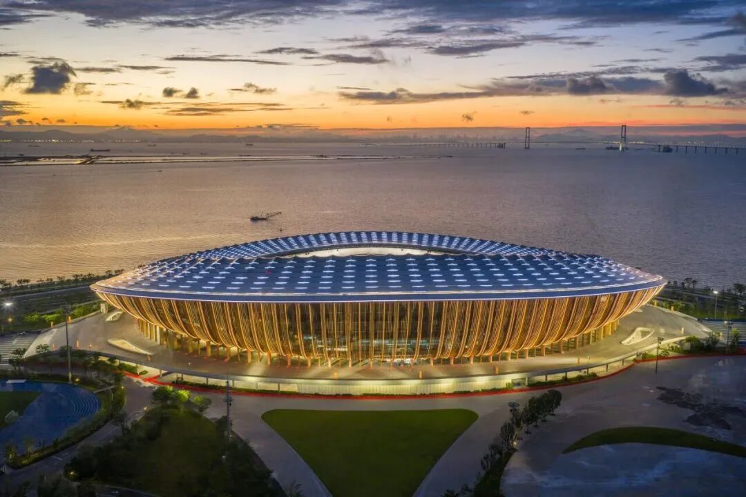 The 60,000-seat stadium takes the layered roof of a traditional silk folding fan as its muse, rising 63.8 m and cantilevering up to 62.5 m. A 145-m-wide “sea-view window” on the east side frames the Lingding Sea so spectators can watch elite sport and ocean vistas in a single gaze.