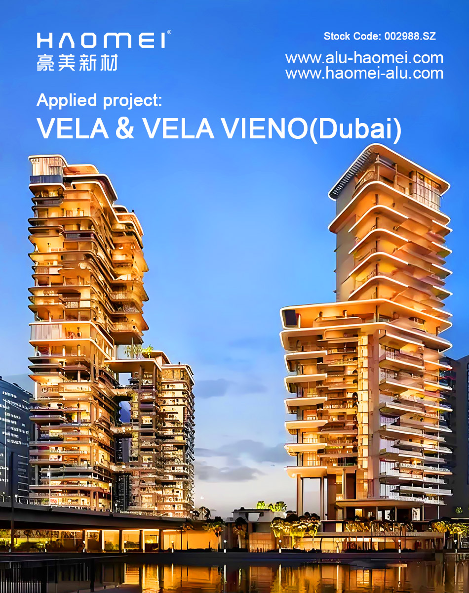 VELA and VELA VIENTO open directly onto the waterfront promenade and Marasi Bay Marina, with sweeping views of the Burj Khalifa and downtown Dubai. VELA rises 150 m across 30 floors and contains 38 residences—some of whose curtain-wall panels and windows were manufactured by Haomei. VELA VIENTO climbs 180 m through 41 floors and comprises 92 apartments, three of them unique bridge apartments that span the tower itself. Iconic curves sculpt the façade, while wrap-around pools and all-glass walls ripple and wave, seamlessly linking indoor and outdoor realms. Stepped terraces extend the coastal landscape, letting each building settle gracefully into its seaside surroundings.
